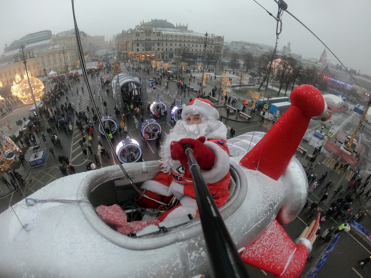 Компания “Московские сезоны” привлекает нас в качестве экспертов и организаторов нестандартных проектов, требующих творческого подхода и высокой степени безопасности. Одним из таких проектов была Ракета на новый год 2019 1020 перед большим театром. Нам была поставлена задача: ЧТО непрерывно на протяжении 3х суток ракета должна летать в пространстве на уровне 6 этажа, над людьми гуляющими по театральному проезду. В ракете должен находиться актер, имеющий допуск на высотные работы в костюме деда мороза и поздравлять всех с новым годом! Командой «дедов морозов», среди которых была даже одна девушка, поставленная задача была выполнена с соблюдением всех требований и норм безопасности.