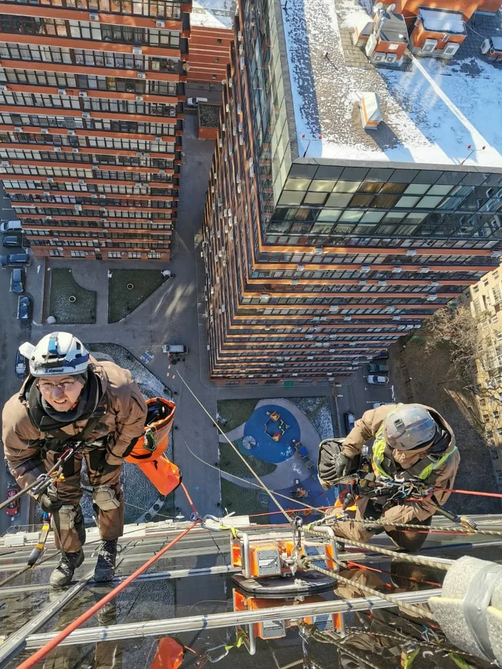 Монтаж несущих конструкций осуществляется изнутри, но монтаж стеклопакетов возможен только со стороны улицы, что представляет серьезную проблему даже на втором этаже, не говоря уже про работу на высоте. С этой задачей не смогут справиться обычные стекольщики, устанавливающие металлопластиковые окна. Фасадное остекление – зона ответственности промышленных альпинистов.